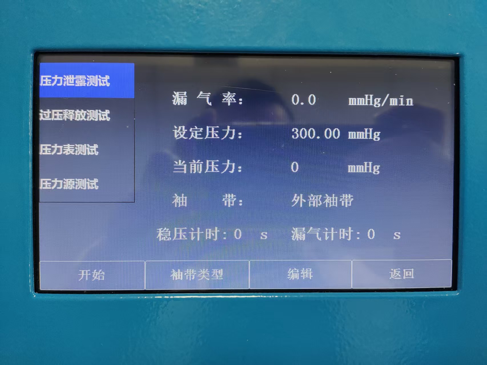 压力由内部压力源提供,450mmHg,始终显示峰值压力和当前压力,漏气率在10秒后显示