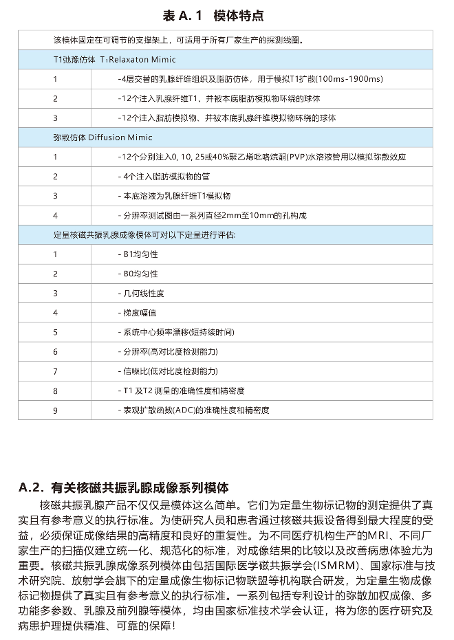 核磁共振乳腺成像模体由两个内部由致密高分子聚碳酸酯结构组成的仿人的柔软硅胶壳构成。每个硅胶壳都内含本体溶液,用以模体乳腺纤维组织T1。其中一个乳腺模体是专用的模拟不同乳腺组织的T1模体,另一个则是弥散模体。乳腺成像校准模体可适用于所有用于乳腺成像的探测线圈。所有的部件经国家标准与技术研究院认证,为核磁共振成像扫描仪、乳腺线圈和成像协议及程序提供的矫正标准。