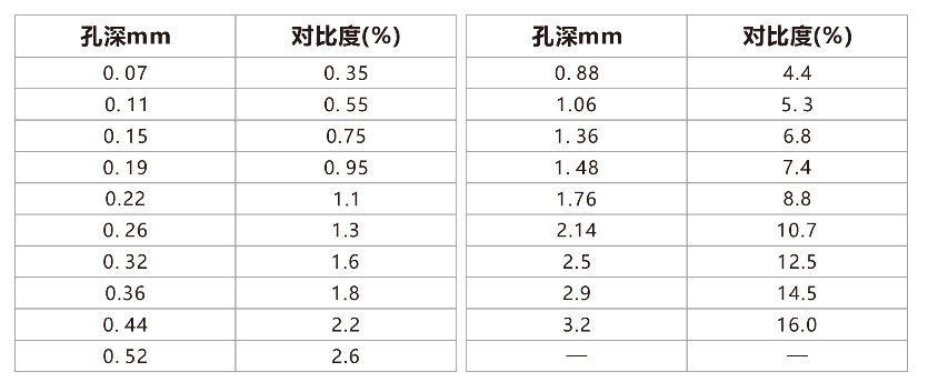 在该铝板上均布 1cm孔径圆孔,孔的深度(mm)及对比度(括号内数值%)从0.07mm(0.35%)到 3.2mm(16%)变化,共计19个圆孔。