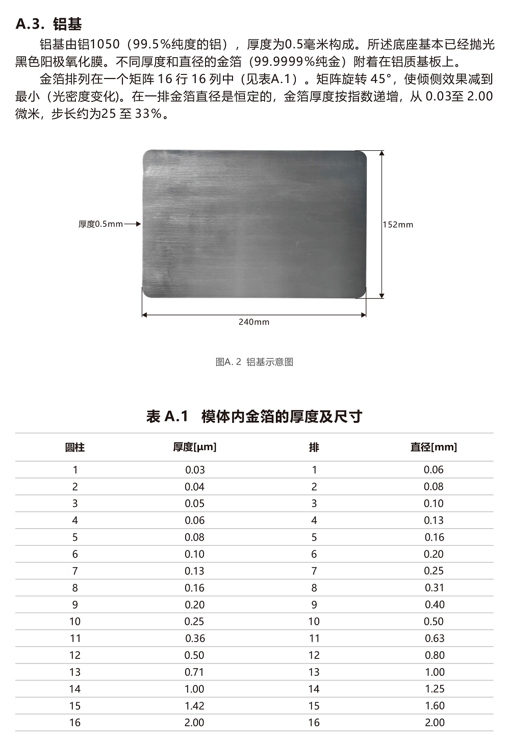 所述乳腺模体,在图A.1中示出,由一个铝质基板和不同厚度和直径的金箔组成,并覆盖有机玻璃。模体还提供4个有机玻璃板,每一个厚度为10毫米。模体和有机玻璃板的尺寸与标准的乳腺X线片尺寸一致(180×240 毫米)。