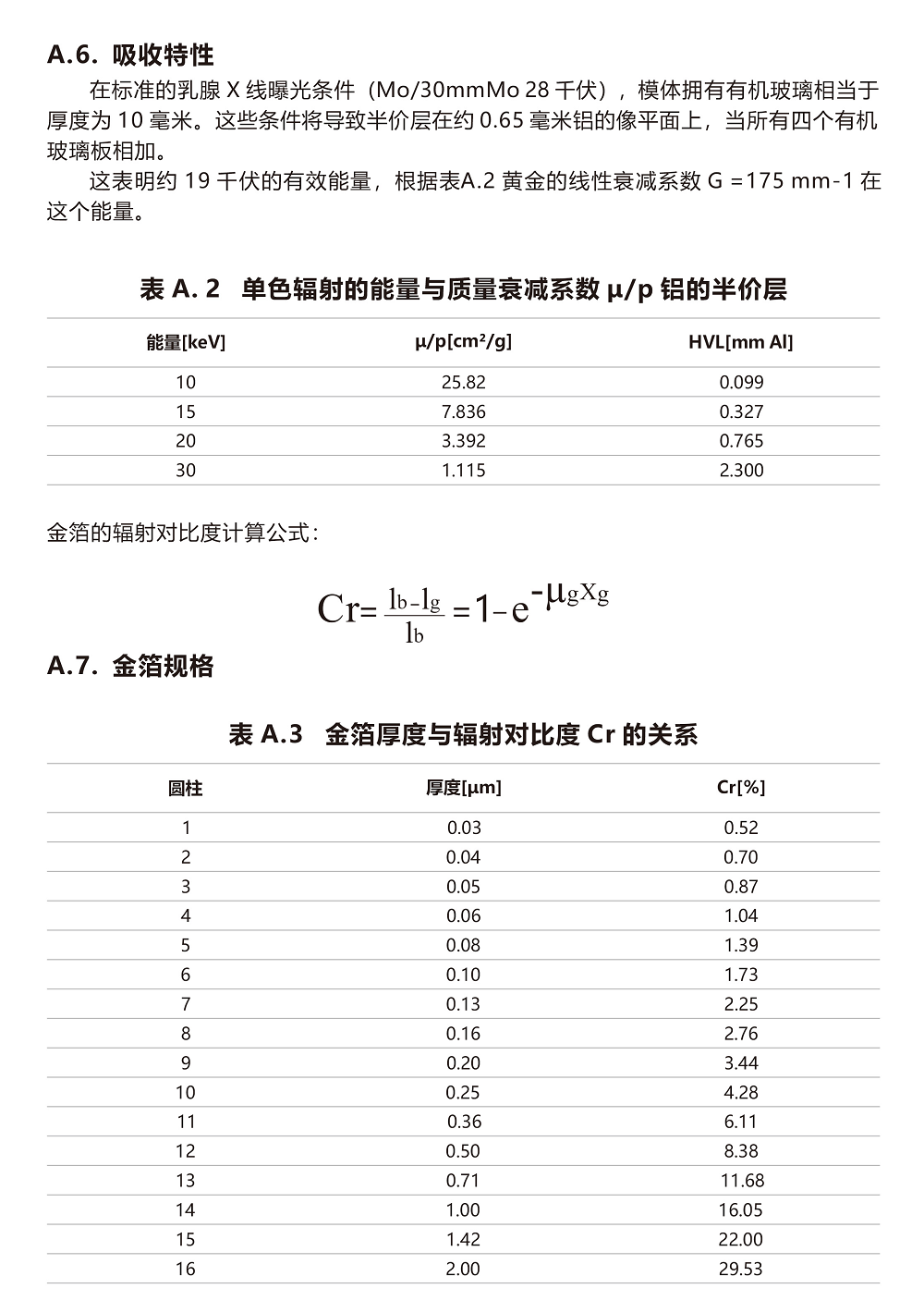 在乳腺3.4 模体中,材料(金箔)的直径为 0.1 - 3.2 毫米,厚度为0.05 至 1.6μm,产生辐射对比范围约为1 - 25%标准条件(Mo/30mmMo 28 千伏)。