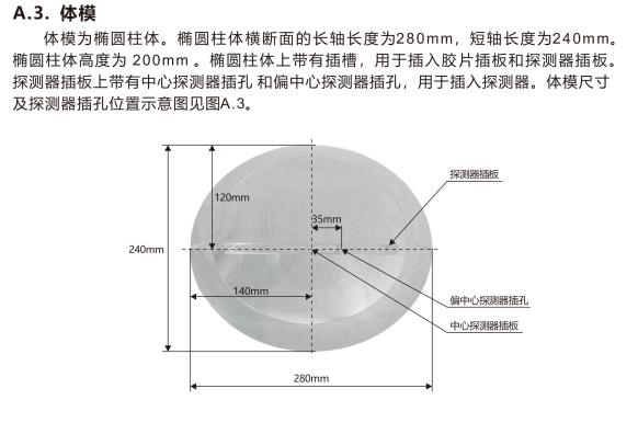 头模为直径160mm的球体,由两个半球及连接件组合而成。两个半球中间有插槽,用于插入胶片插板和探测器插板。探测器插板上带有中心探测器插孔和偏中心探 测器插孔,用于插入探测器。头模尺寸及探测器插孔位置示意图见图A. 1。