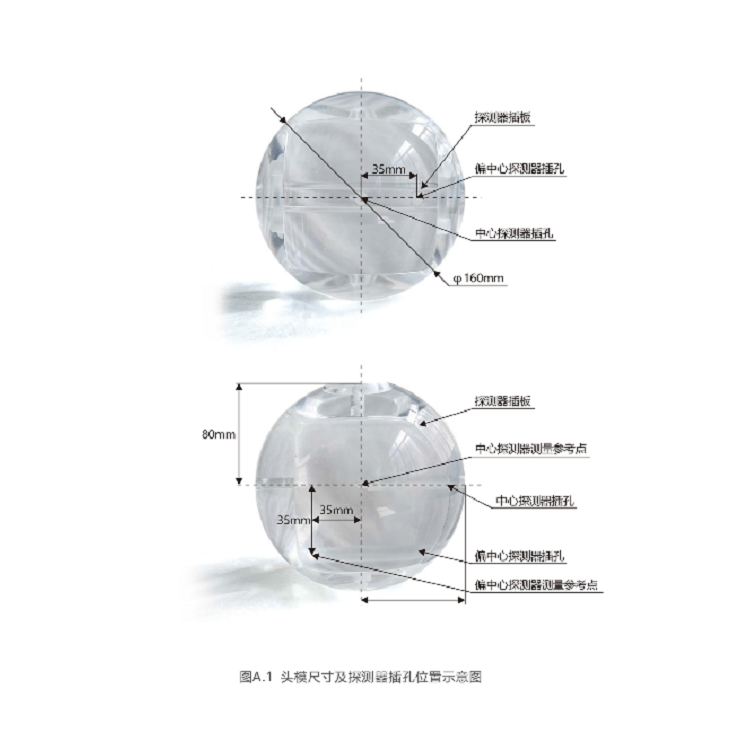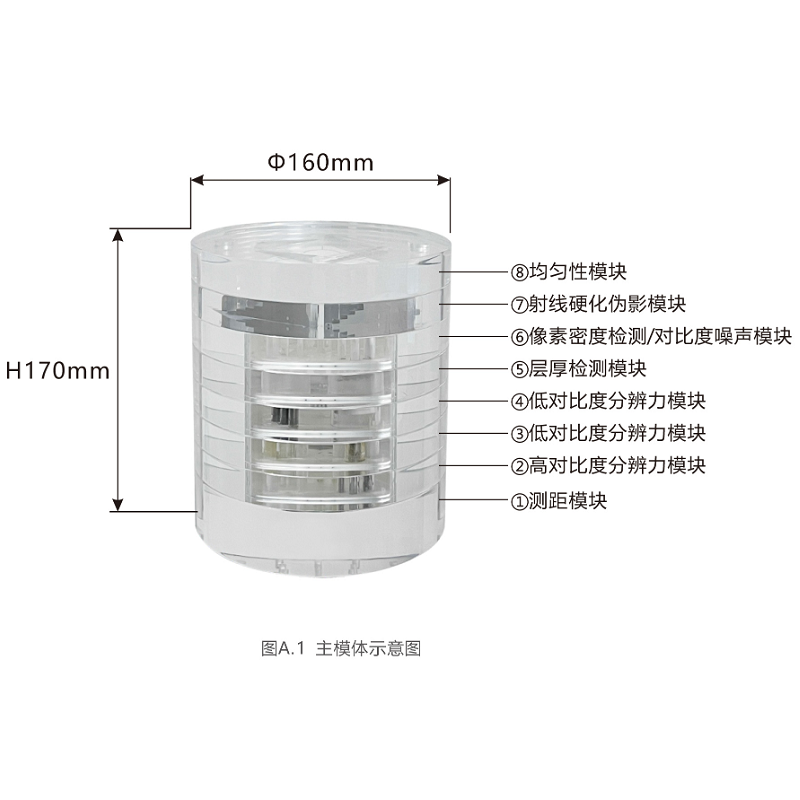 A.1.1 圆柱体直径 160mm,总高度 170mm,材质:聚甲基酸甲酯(PMMA)。