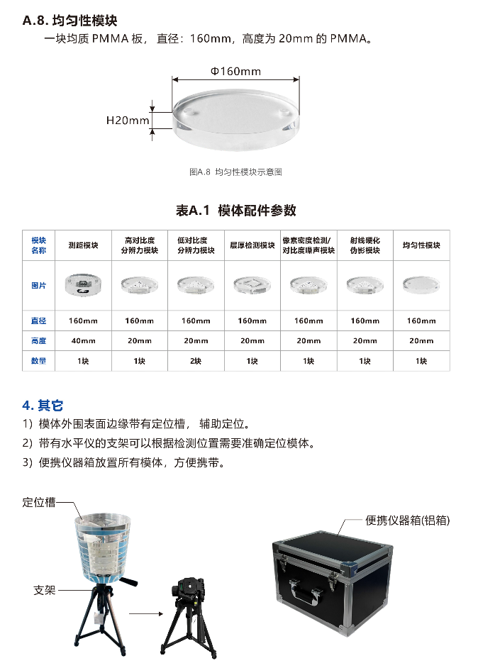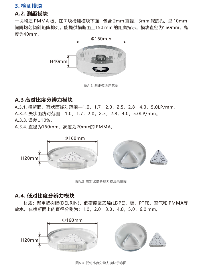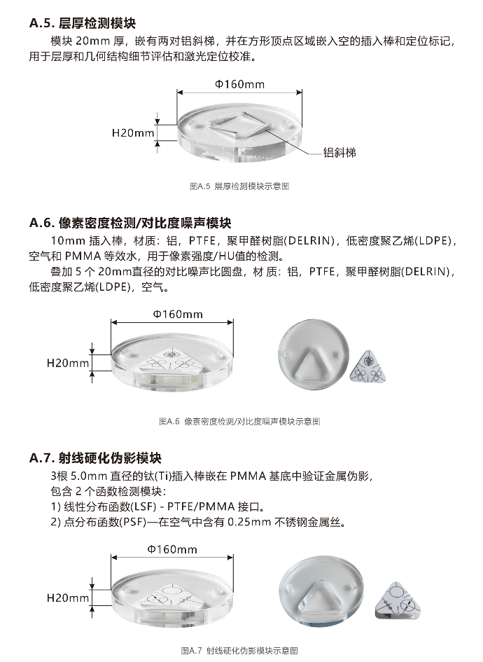A.1.3 8 个模块分别是:高对比度分辨力模块 1 块,低对比度分辨力模块 2 块,均匀性模块 1 块,测距误差模块 1 块,层厚模块 1 块,像素密度/对比度噪声模块 1 块,射线硬化伪影模块 1 块。