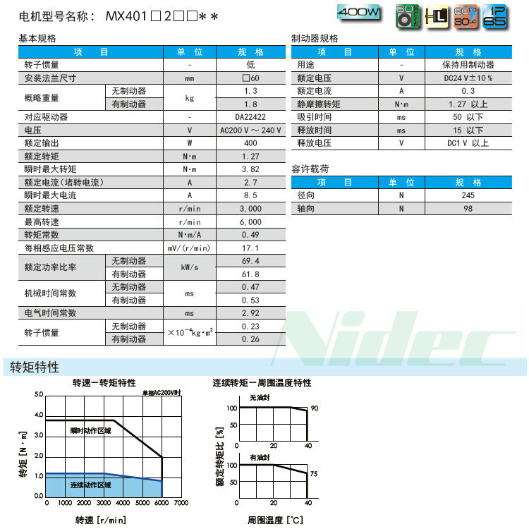 Nidec 400W伺服电机 MX401P2SA11/日本电产 400W伺服放大器 DB62411、DB62441、DA22423、DA22424
