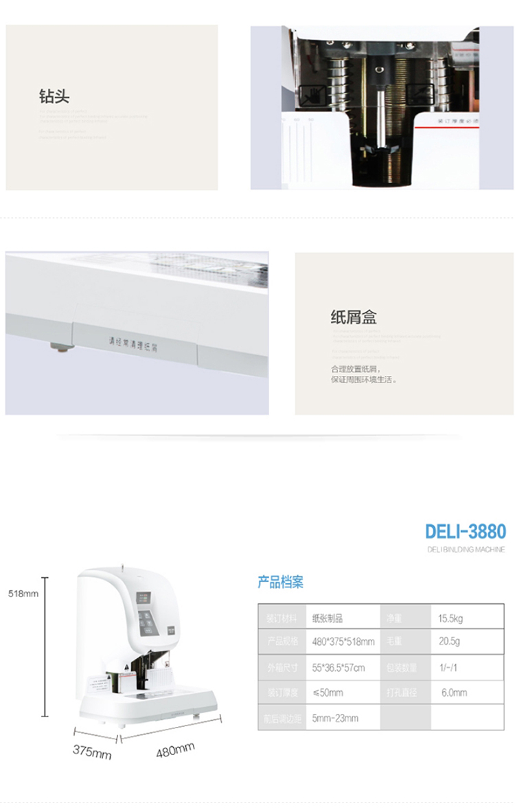钻刀、垫片、铆管属于装订消耗品,不在质保范围内.钻刀寿命请根据凭证的装订量进行更换.钻刀如定期对刀刃进行磨刀,可以延长钻刀使用寿命.垫片是可以转圈使用的,一圈都打满孔后建议更换.垫片起到一个支撑和缓冲作用,可以反复使用的.打孔打在垫片的周围,当一个位置打孔次数多了以后,可以转动垫片,重复使用,直到一个垫片周围都都打满不能使用后,再进行更换.不同的机型请适配对应的耗材.温馨提示2:装订过程中,请务必将凭证资料中的订书机、大头针、曲别针等非纸张硬物去除彻底避免打孔时钻刀受损.钻刀受损后刀刃上就会有豁口,导致凭证打孔时打不透.温馨提示3:打孔的时候,若打孔钻头堵住,只需把通针放在钻头下方,轻轻压下钻头管子就通了.不要在堵住的时候用力按压,这样容易引起打孔钻头爆裂或者断掉.得力3880产品类型:自动财务凭证装订机打孔规格:打孔直径:6mm装订能力:500张/次装订厚度:50mm产品尺寸:480x375x518mm产品重量21-30kg产品毛重:18.77kg其他特征:孔型:圆孔装订方式:半自动装订自动激光定位.自动加语音提示.自动打孔,自动装订简单方便.触摸式按键,操作便捷省力.大容量装订空心钻刀合理放置纸屑盒