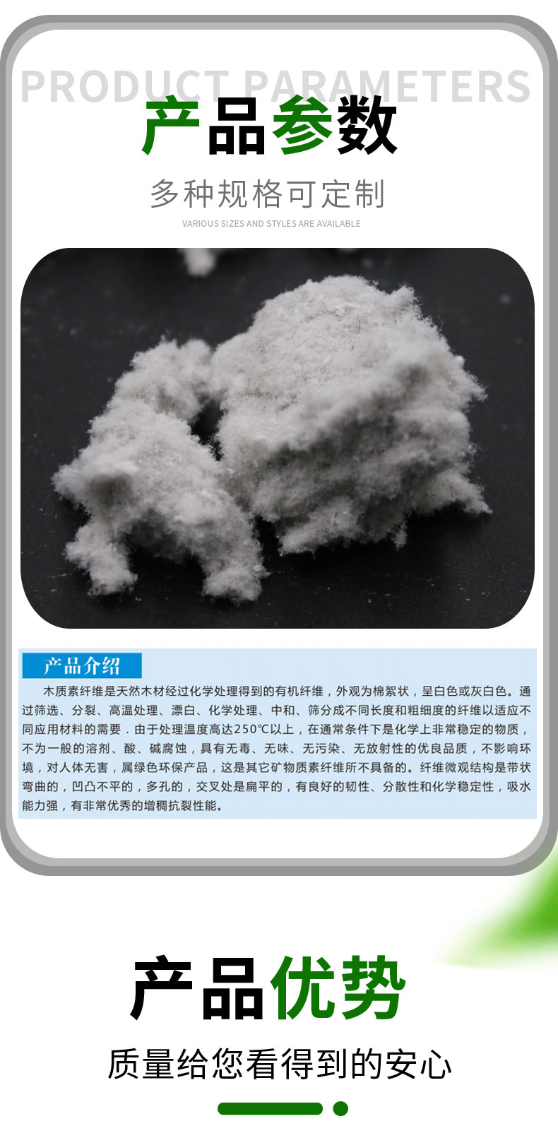 木质素纤维是天然木材经过化学处理得到的有机纤维,外观为棉絮状,呈白色或灰白色。[1] 通过筛选、分裂、高温处理、漂白、化学处理、中和、筛分成不同长度和粗细度的纤维以适应不同应用材料的需要.由于处理温度高达250℃以上,在通常条件下是化学上非常稳定的物质,不为一般的溶剂、酸、碱腐蚀,具有无毒、无味、无污染、无放射性的优良品质,不影响环境,对人体无害,属绿色环保产品,这是其它矿物质素纤维所不具备的。纤维微观结构是带状弯曲的,凹凸不平的,多孔的,交叉处是扁平的,有良好的韧性、分散性和化学稳定性,吸水能力强,有非常优秀的增稠抗裂性能。
