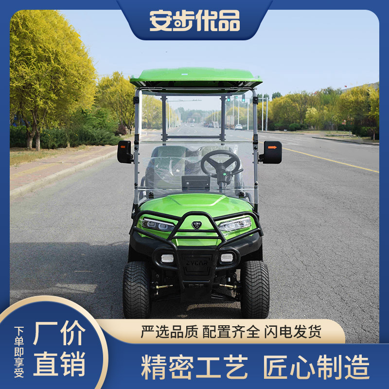高尔夫球车是一种供高尔夫球场使用的小型电动车辆。它通常用于运送高尔夫球手和他们的装备在球场上移动。高尔夫球车通常有两个座位、电动驱动系统和一套电池来提供能量。球车上还配有草地友好的轮胎,使其在草坪上移动时损坏球道。高尔夫球车可以帮助球手地穿越球场并省去步行的时间和劳力,提供更舒适的高尔夫体验。