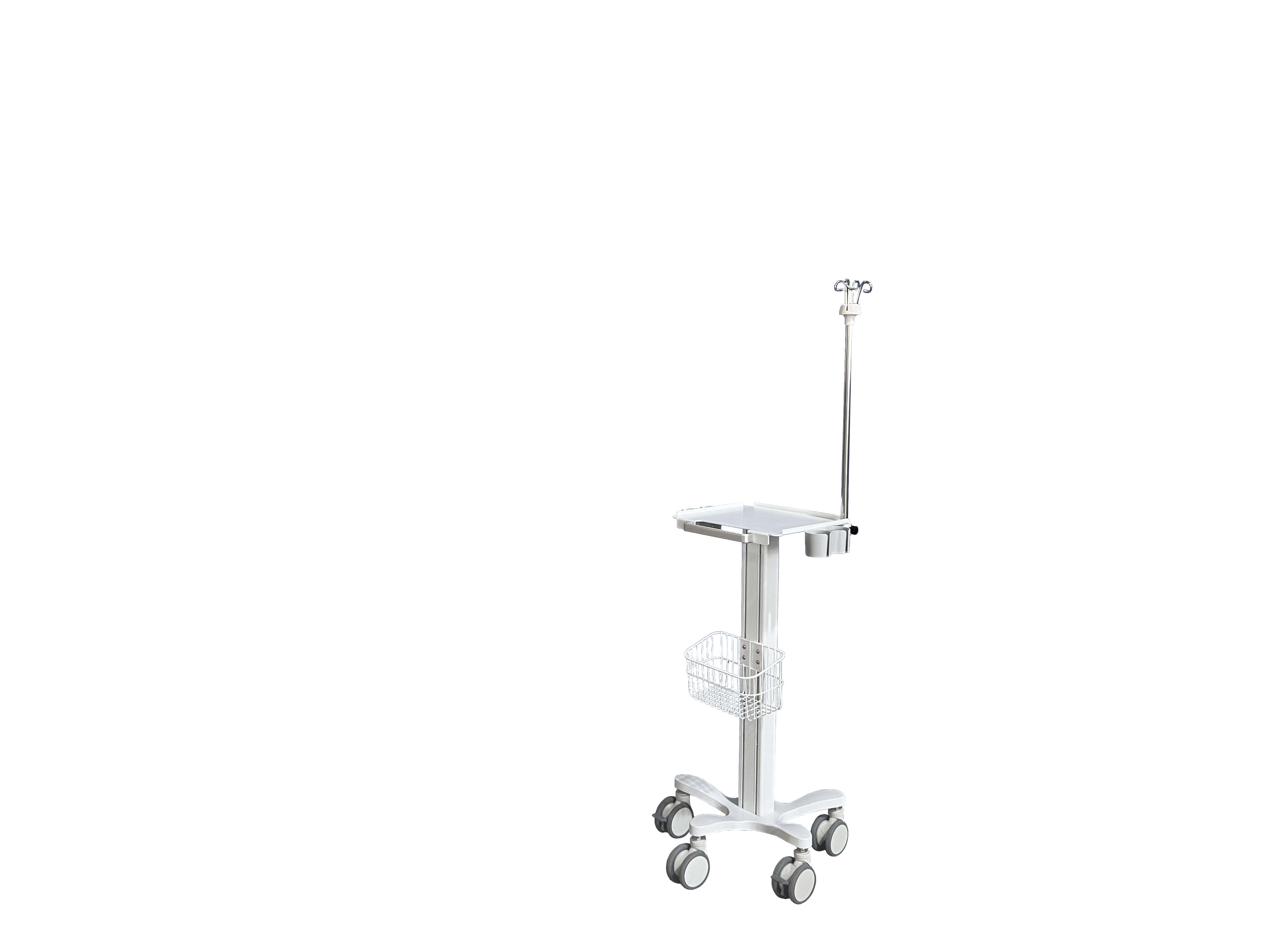 此款推车是我公司自主研发的多功能小型医疗设备推车,可以扩展为便携超声推车、推车、监护仪推车、呼吸机推车、麻醉机推车、心电图推车、除颤仪推车,胎儿监护推车、输液泵推车、康复仪推车、美容仪推车等,通用性强。全车模块化设计,可随意增减配置,自行调节层高,可个性化定制,更适合人体功能学所需,实现了真正意义上的一车多用。可以根据不同仪器设备的需求定制各种平台及设备底座,可加装升降功能,可加装储物篮筐、资料盒、收纳箱等,可将线路隐藏在立柱内,实现外观整齐不凌乱; 搭载静音万向医用脚轮并配有制动装置,灵活推拉,轻松锁定。推车采用冷轧钢板、ABS工程塑料及高强度铝合金型材组装而成,美观大方,轻巧耐用,为手术室和病房节省更多空间;所有表面均经过特殊打磨处理及喷塑,无菌、防滑、耐腐、易清洁,是医护人员的贴心小助手。