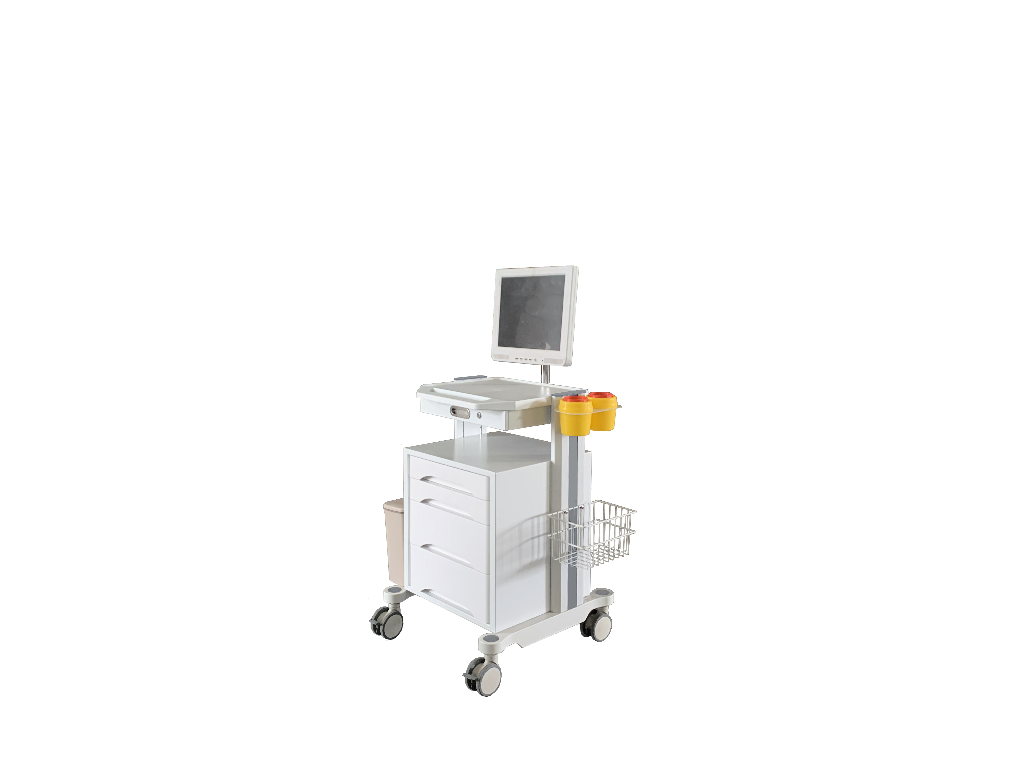 此款推车是我公司自主研发的多功能医用护理推车,可以扩展为医院信息化推车,接入软件后可以轻松对接医院的各种系统,实现医院信息化的整合,对病人的个人信息、诊疗信息以及医护人员的职责更清晰,同时又能实现移动护理、移动送药、移动查房、移动抢救、移动探视等,做到真正的可移动综合医护工作站。全车模块化设计,可随意增减配置,自行调节层高,可个性化定制,更适合人体功能学所需,实现了真正意义上的一车多用。可加装显示器支架,摄像头支架,扫描枪挂架,内镜挂架,杂物置物篮,分类垃圾桶,利器盒,洗手液消毒液支架等,可定制箱体大小及抽屉层数,可将线路隐藏在立柱内,搭载静音万向医用脚轮并配有制动装置,灵活推拉,轻松锁定。推车采用冷轧钢板、ABS工程塑料及高强度铝合金型材组装而成,美观大方,轻巧耐用。所有表面均经过特殊打磨处理及喷塑,无菌、防滑、耐腐、易清洁,是医护人员的贴心小助手。