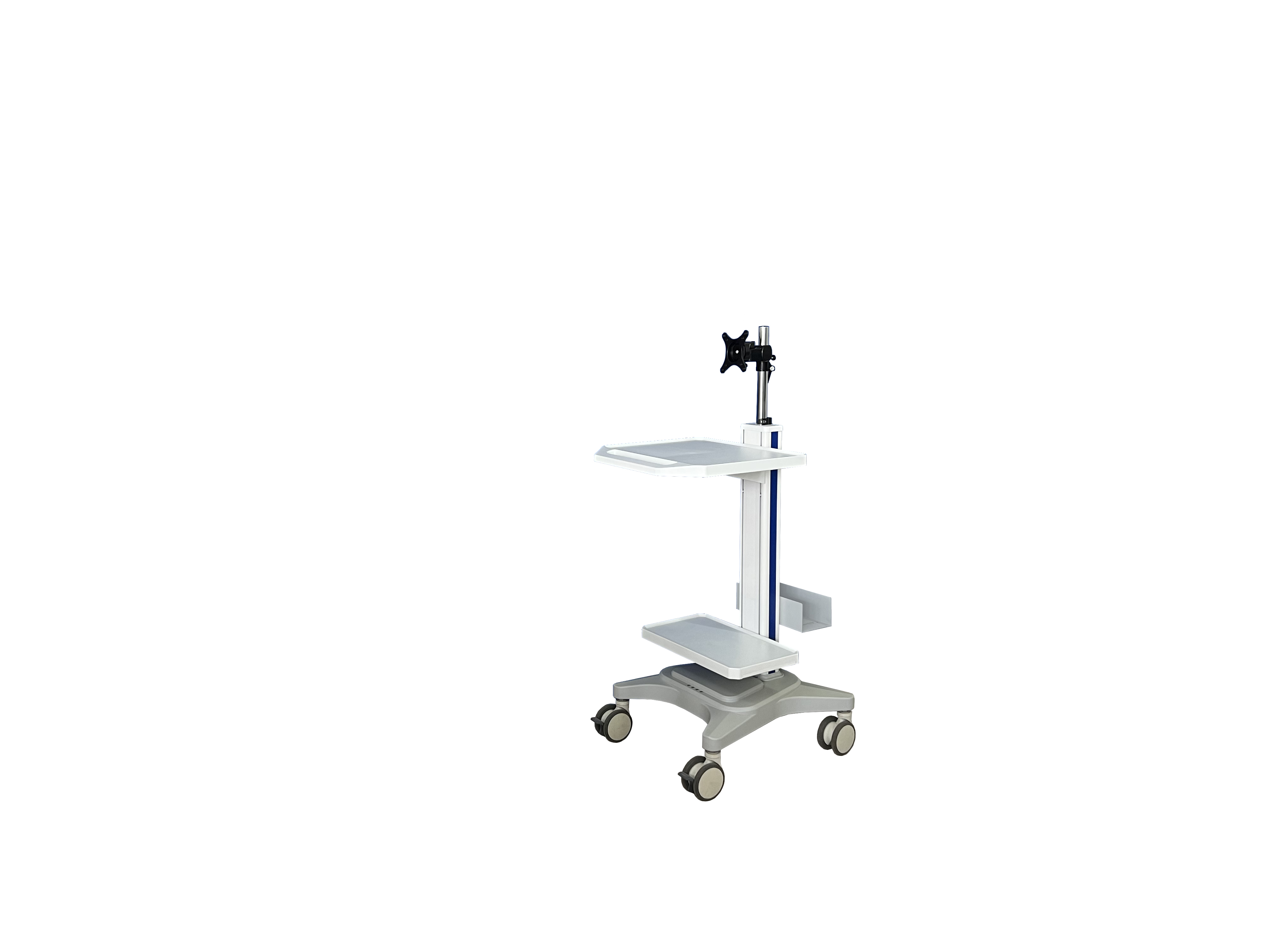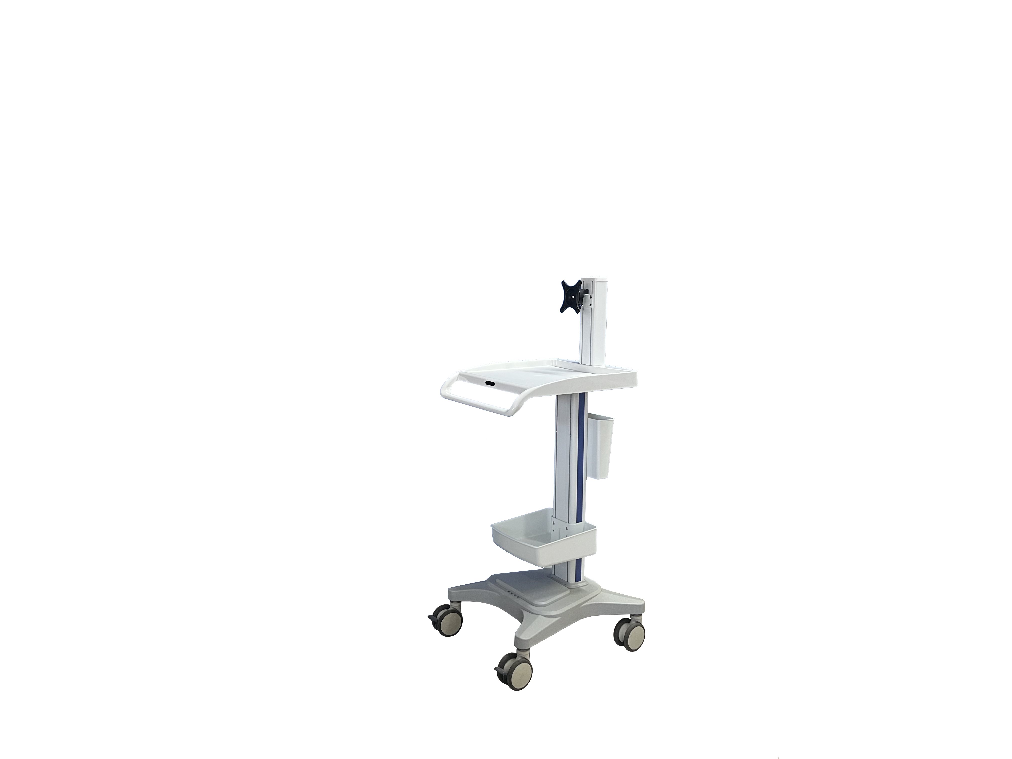 此款推车是我公司自主研发的多功能查房推车,首先可以应用在医疗领域:如医生查房,护士查房,重症监护查房,探视查房、远程查房,无线查房,5G查房等等; 还可以应用在工业/互联网领域,比如工控机房查房,网络机房查房,运维查房,仓库查房等。可以轻松安装一体机电脑,平板电脑,台式电脑,笔记本电脑,也可以搭配移动电源,轻松实现移动供电。全车模块化设计,可随意增减配置,自行调节层高,可个性化定制,更适合人体功能学所需,实现了真正意义上的一车多用。可加装升降功能,可加装打印机托盘、电脑主机托架、储物篮筐、资料盒、收纳箱、小抽屉、扫描枪挂架、内镜挂架、摄像头支架等,可将线路隐藏在立柱内,搭载静音万向医用脚轮并配有制动装置,灵活推拉,轻松锁定。推车采用冷轧钢板、ABS工程塑料及高强度铝合金型材组装而成,美观大方,轻巧耐用,为医护人员移动查房和移动送药护理保驾护航;所有表面均经过特殊打磨处理及喷塑,无菌、防滑、耐腐、易清洁,是医护人员的贴心小助手。