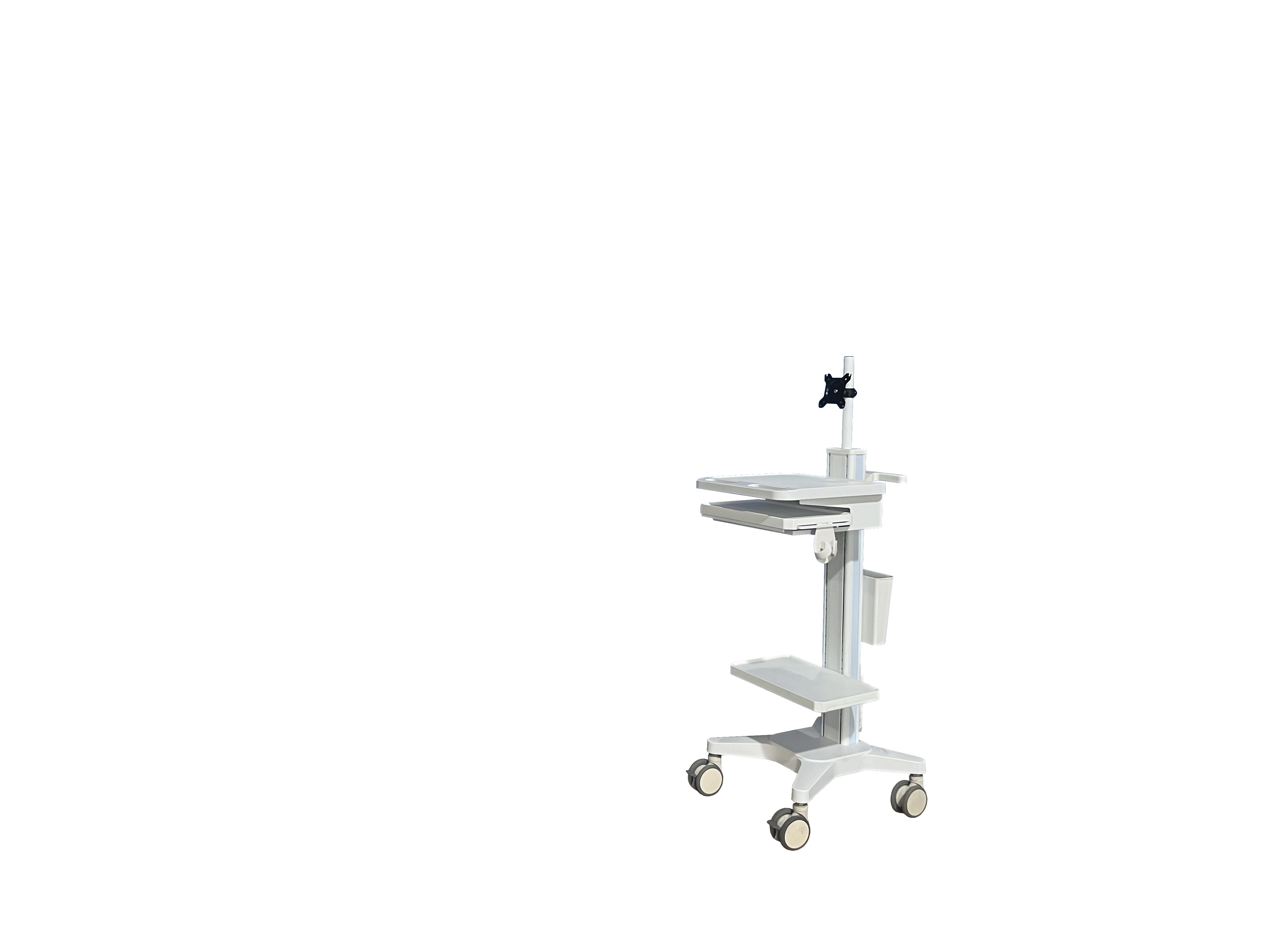 此款推车是我公司自主研发的多功能电脑推车,可以扩展为笔记本推车,一体机推车,电脑主机推车,电脑打印机推车,平板电脑推车等;此款推车的出现很好的解决电脑设备和附属配件集成和移动的问题,从而达到灵活办公,美观整齐的效果;推车内可以加装锂电池为电脑设备供电,可以加装显示器挂臂实现360度旋转悬停,还可以加装双屏或者三屏支架实现多屏互联;高品质静音脚轮,万向刹车,多方向移动无障碍;储物篮筐,小抽屉,打印机托盘,杂物盒等方便放置随机配件;推车采用冷轧钢板、ABS工程塑料及高强度铝合金型材组装而成。外形设计简洁大气、结构稳定材质耐用、更适合人体功能学所需。可以广泛应用在医疗,工业,教育,互联网等各种领域,通用性强。