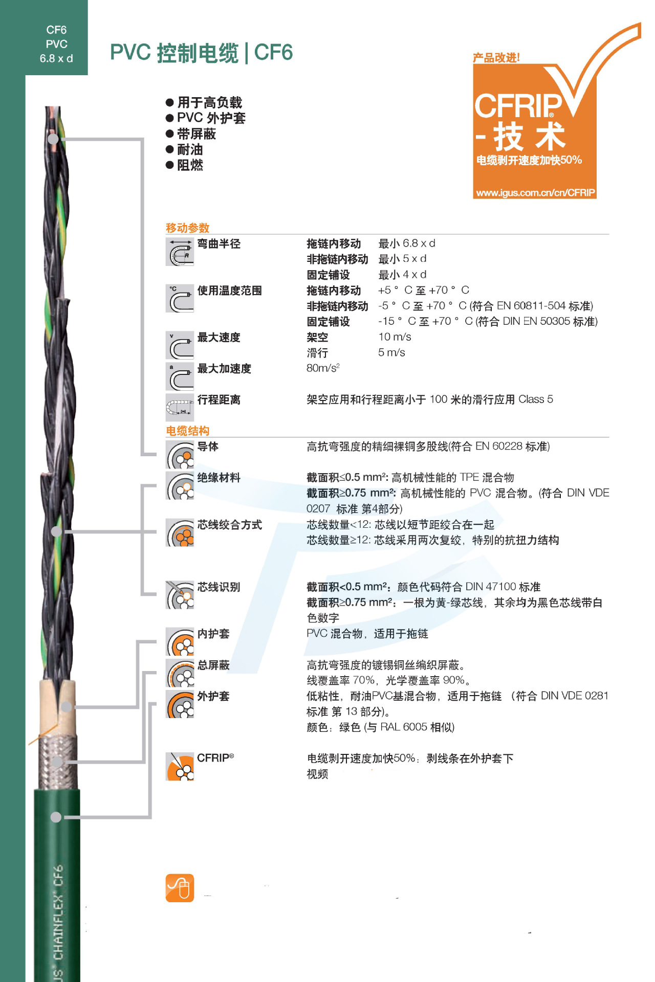 德国 IGUS电缆 易格斯电缆 PVC耐油护套 高负载屏蔽拖链电缆CF6