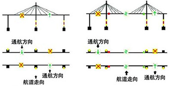 设置于桥梁通航孔正上方,为双向通航标志,航道方向,靠右行驶。贴膜:白底绿标。灯质:绿色定光