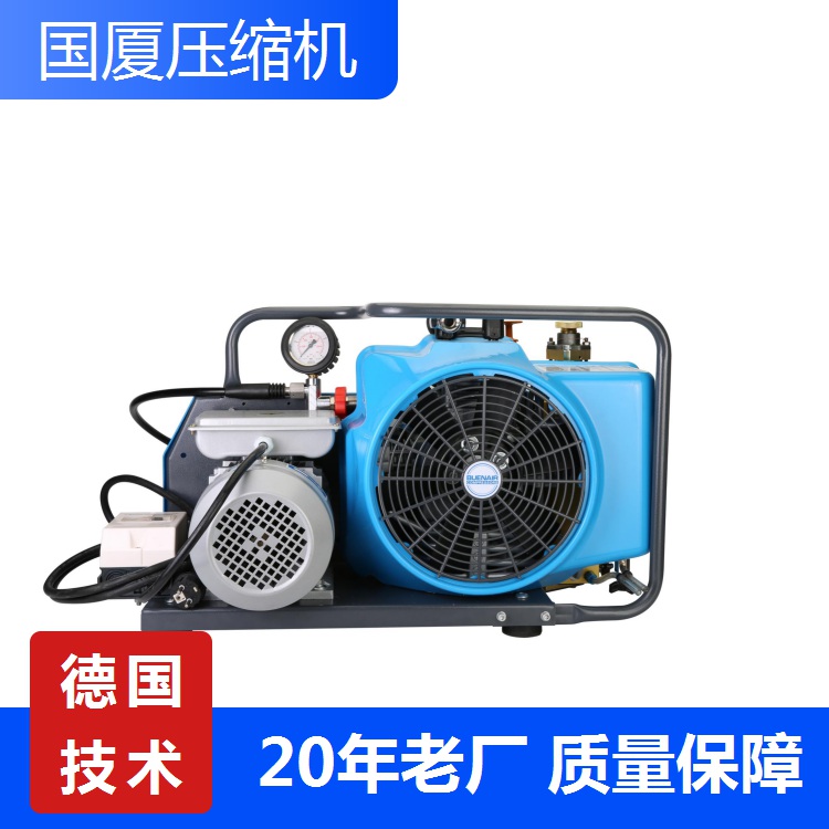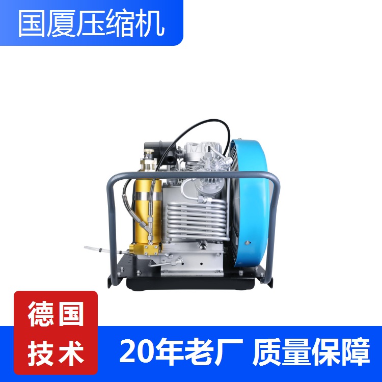 型号GSW100,工作压力30-35MPA,排气量100L/min,压缩级数3级3缸,行程24mm,转数,2300r/min,电机防护等级IP54/IP55,功率2.2KW,尺寸700*380*420mm,重量46Kg