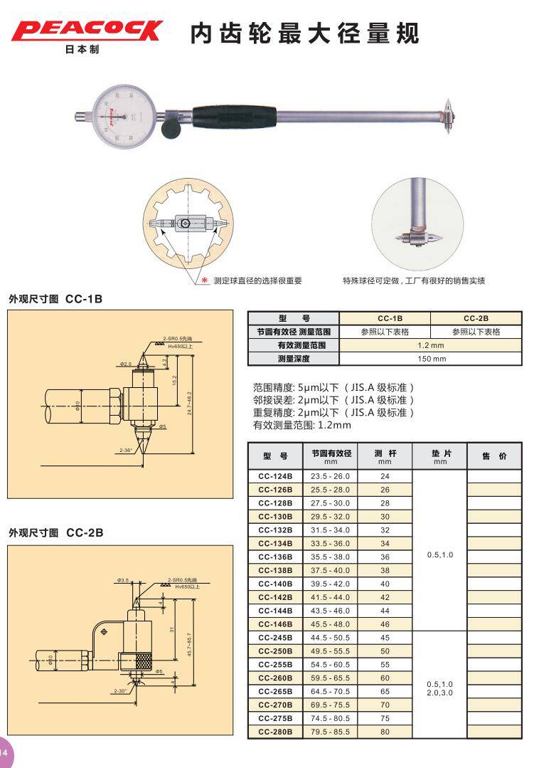 Peacock日本进口内齿轮径缸规CC-124HB