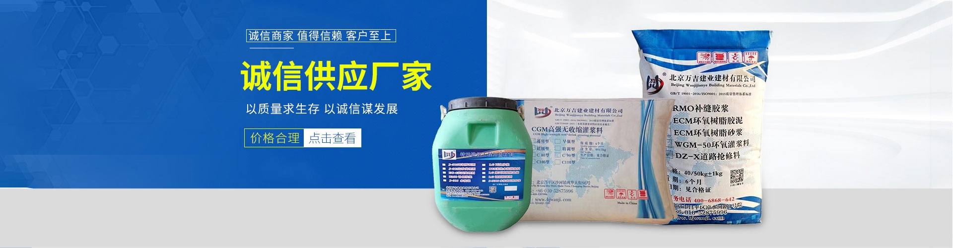 我们公司主营产品:环氧树脂胶泥(环氧砂浆),高强无收缩灌浆料、环氧树脂灌浆料,聚合物高强修补砂浆、聚合物水泥防水砂浆、混凝土高强加固砂浆、A级环氧结构胶(粘钢胶、植筋胶、灌缝胶、碳布胶、灌钢胶、界面胶)、108胶粉、混凝土起砂处理剂、回弹增强剂、高强界面处理剂等产品已销往全国各省、市、自治区,广泛应用在高速铁路、冶金、石化、电力、煤炭... 查看更多>