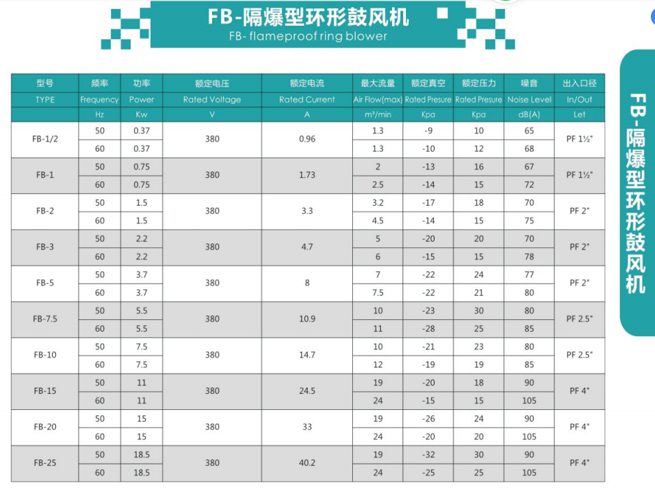 FB-3/2.2kw全风防爆高压风机厂家轴 承:真空风机原装日产NSK及SKF轴承,具有高速耐高温特质并且接纳密封防尘设计防备尘土进入并侵蚀轴承,加长使用年限,高压风机是指在设计条件下,风压为30kPa~200KPa或压缩比e=1.3~3的风机,高压风机适用范畴:产业机器,塑胶机器,印刷机器,照相制版,电器设备,医疗设备,百般熄灭机,汽锅,环调养殖业等等。当前行业内一般是把气环式真空泵划归为高压风机,采用特殊叶片设计,其叶片制造度高、耐磨损、风力大、使用寿命长。高压风机,也叫高压鼓风机,区别于一般离心式鼓风机 风机,叶轮直接与电机轴相连,在旋转中无需其他配件,在运行中没有摩擦,更无需内部润滑,因此输出的空气完全无油,纯净环保。