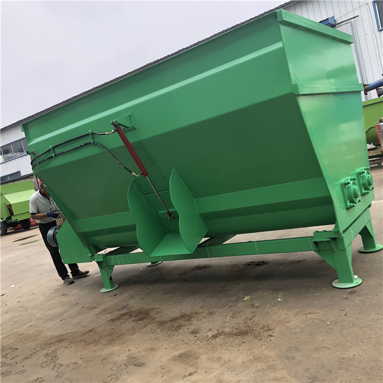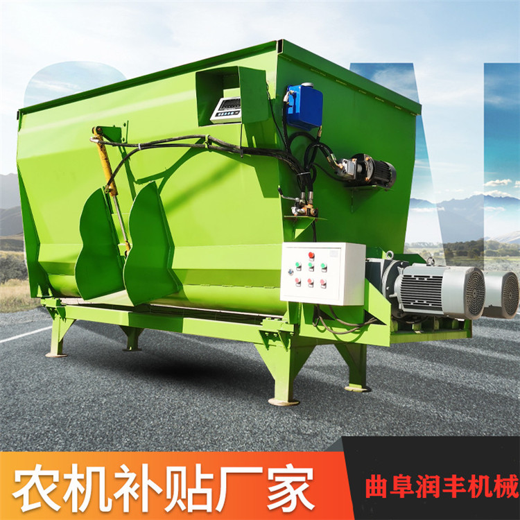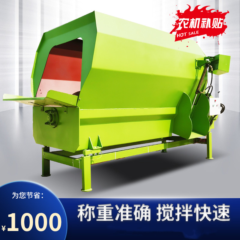 2、移动式可直接用拖拉机牵引、边移动边混合,直接抛撒在牛场内饲喂,节省时间和劳动力。固定式采用电机驱动、,运营成本低。