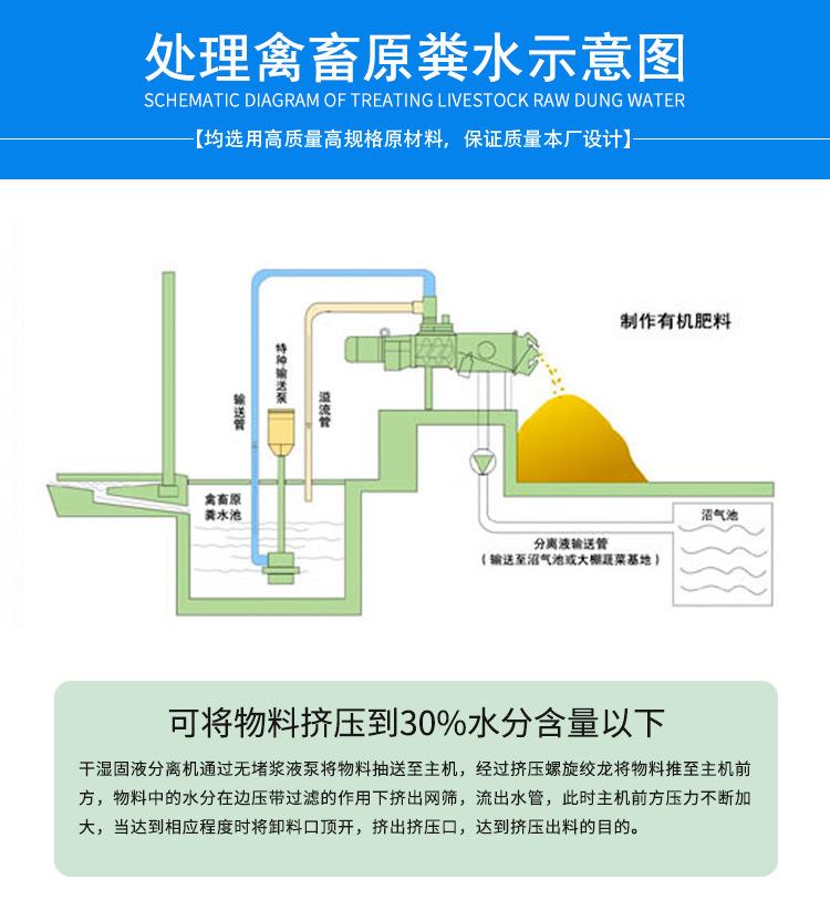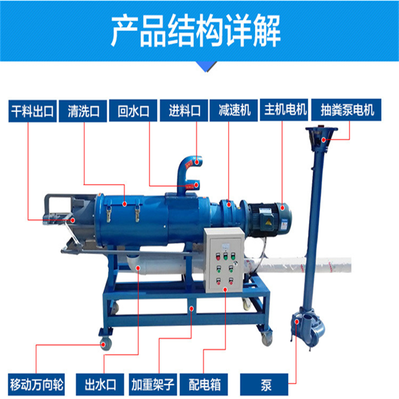 主要有机体、网筛、挤压绞龙、减速电机、配重、卸料装置的部位组成。该机可广泛作为鸡、牛、马及各类集约化养殖场对纸浆、动物粪便、酒糟、药渣、淀粉渣、酱渣、屠宰厂等高浓度有机污水的渣液分离。