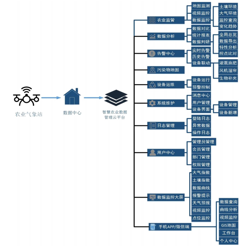 智慧农业数据管理云平台支持多种农业植物生长环境气象监测仪器数据同时接入,实现各项监测数据的同屏展示和查看,为准确分析农作物生长环境气候状况和空气质量状况,提供全面的数据支撑。