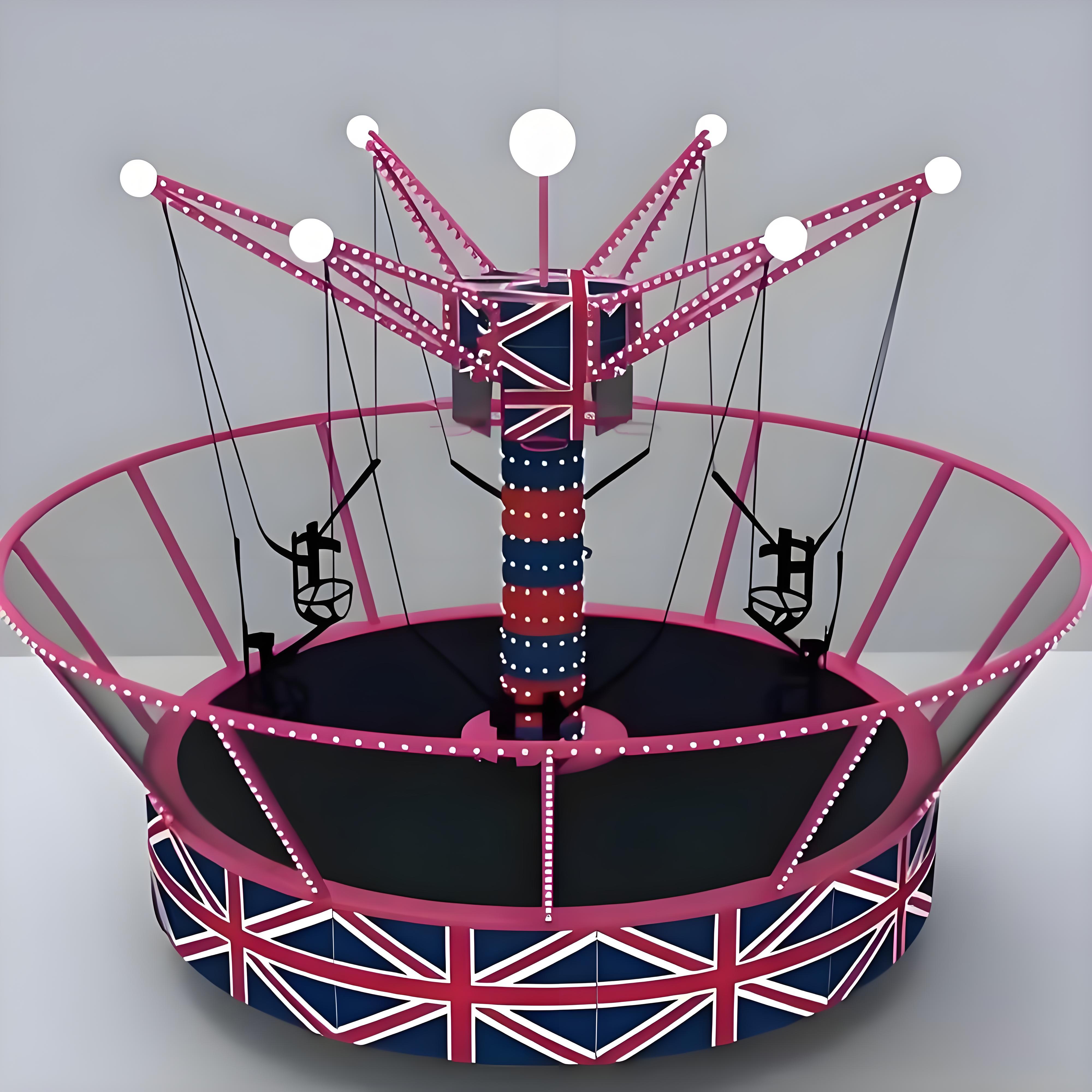 六人旋转蹦极游乐设备是一种集、运动和互动于一体的游乐设施,专为儿童及家庭设计,能够容纳六人同时参与蹦跳活动,并增加了旋转功能,使蹦跳过程更加多样和有趣。