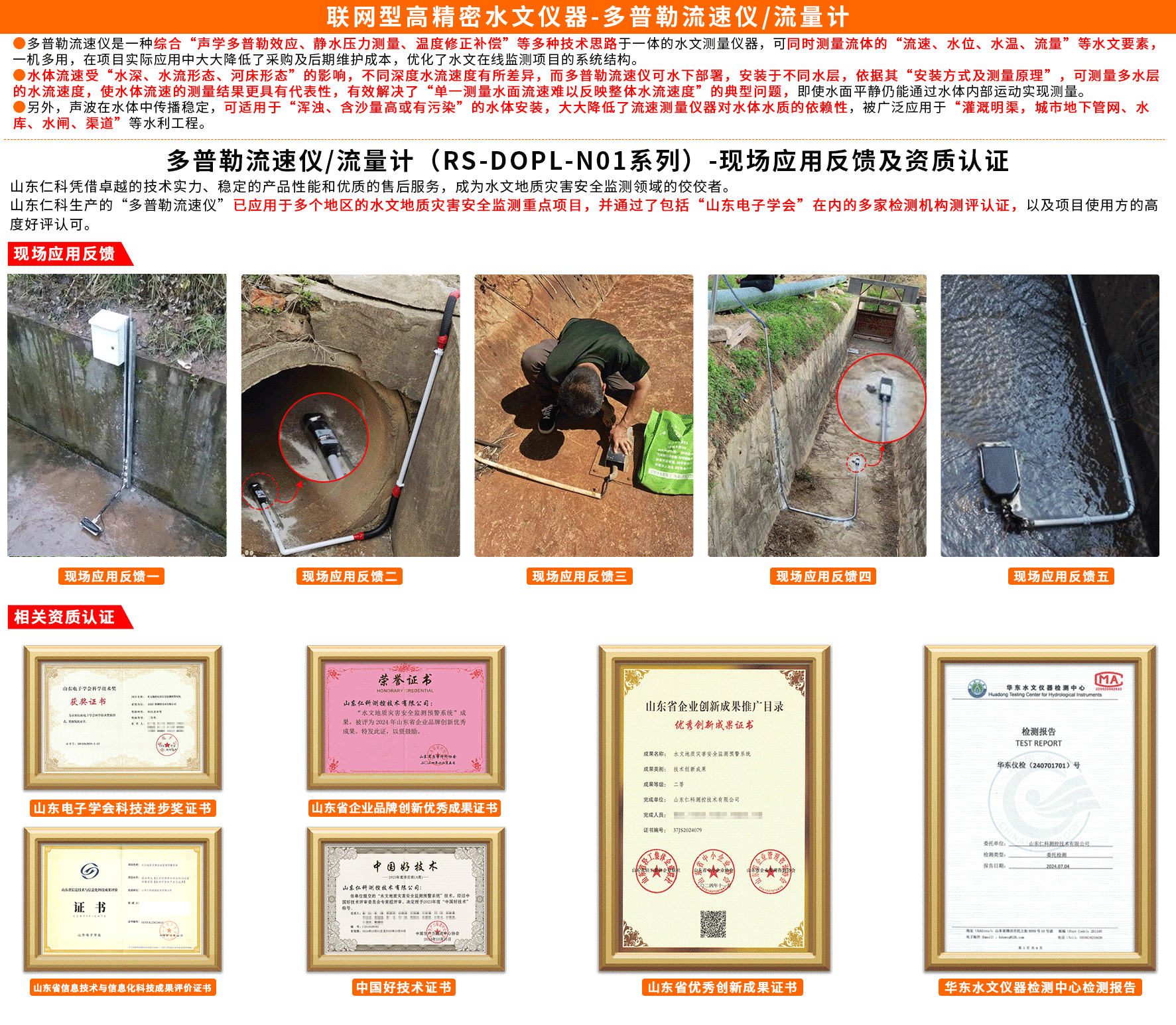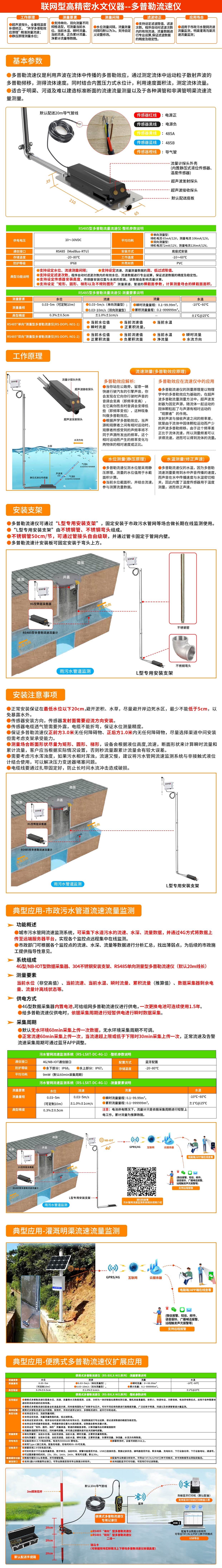 ●多普勒流速仪是一种综合“声学多普勒效应、静水压力测量、温度修正补偿”等多种技术思路于一体的水文测量仪器,可同时测量流体的“流速、水位、水温、流量”等水文要素,一机多用,在项目实际应用中大大降低了采购及后期维护成本,优化了水文在线监测项目的系统结构。