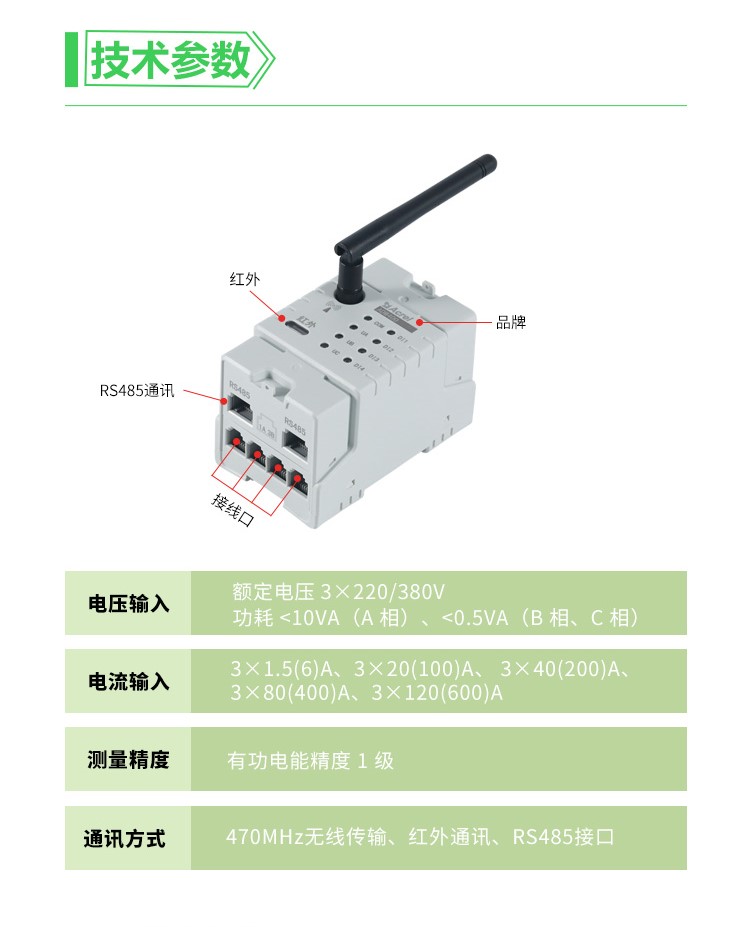 ADW400环保监测模块主要用于计量低压网络的三相有功电能,同时可选择四个回路的电流输入,具有RS485通讯和470MHz无线通讯功能,方便用户进行用电监测、集抄和管理。可灵活安装于配电箱内,实现对不同区域和不同负荷的分项电能计量,统计和分析。