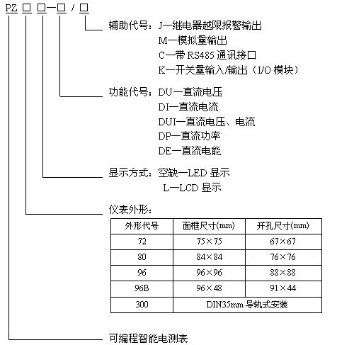 根据开孔不同型号还分:pz72-de、pz72l-de、pz80-de、pz80l-de、pz96-de、pz96b-de、pz300-de(导轨安装)。