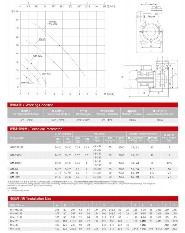 电动Aulank高温热导泵WM-10泵热油泵/200度油泵/750w/1HP水泵模温