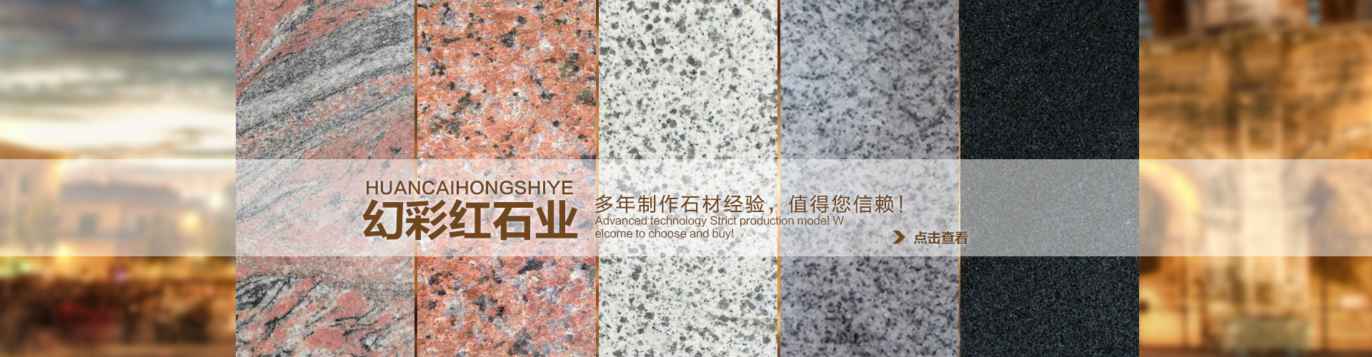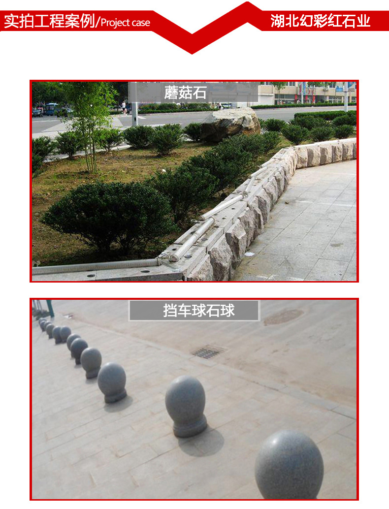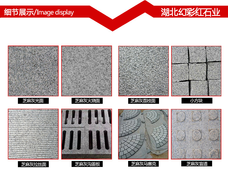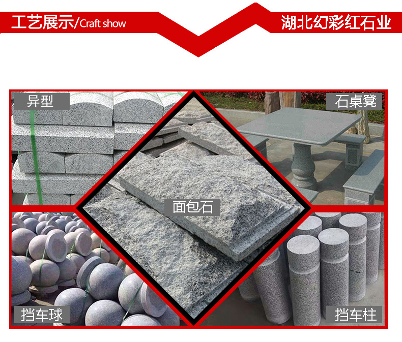 湖北幻彩红石业有限公司是由湖北石通矿业有限公司自有数座矿山。主要石材品种有:芝麻白、芝麻灰、芝麻黑、黄金麻、黄锈石、白麻、灰麻、G603、G654、G655、卡基诺金,深灰麻,卡拉麦里金,黄金钻等系列产品。生产提供:毛光板、工程板、火烧板、盲道板、广场板、干挂板、楼梯踏步、剁斧板、荔枝面、拉丝面、路沿石、异形石材等。提供花色分别有:大花、中花、小花。被广泛用于广场、车站、飞机场、公园、宾馆、酒店、别墅、市政园林工程、陵园公墓等各类建筑墙体、地面、桌面装饰装修