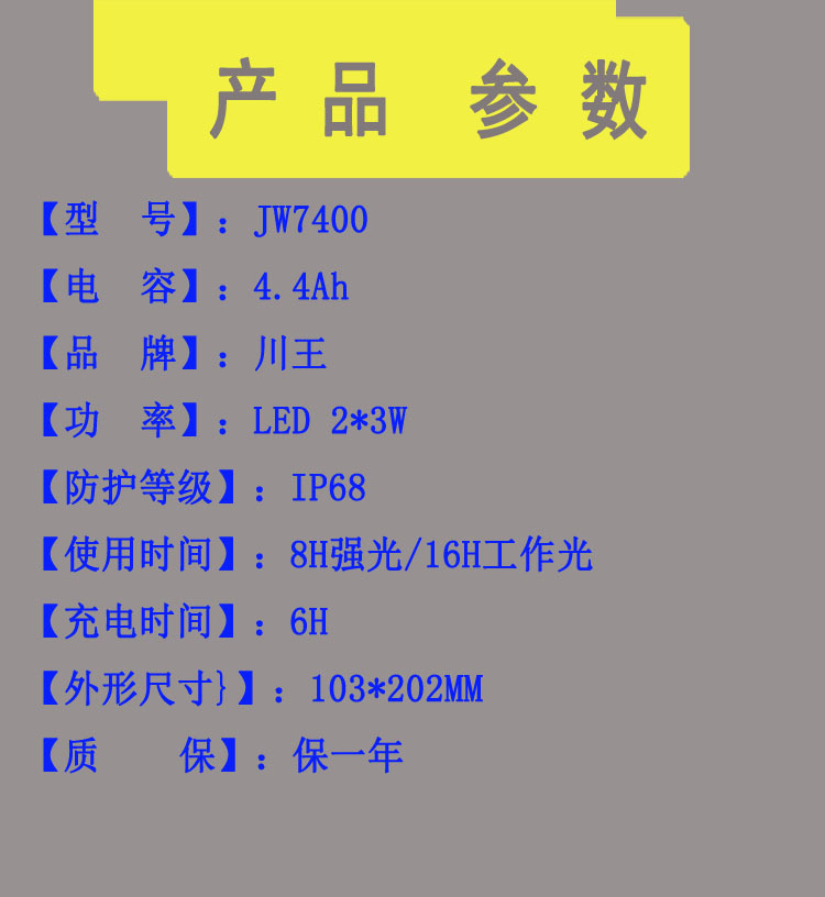二、JW7400性能特点 1.光源选用进口特制超高亮度LED光源,能耗低、光效高、光线柔和、无眩光、不引起作业人员眼睛视觉疲劳,提高工作效率。2.高能无记忆聚合物锂电池,高能量密度、容量大、无污染、经济环保、可循环使用、良好的高低温性能、荷电保护能力强、寿命长、安全可靠、健康安全,可随时充电,一次充满电后,放置半年储电量不低于满容量的95%,两年内不低于满容量的80%。3.智能型LED驱动电路使产品更加安全可靠,内置电池保护板设有过充、过放、过流和短路保护装置,切实保证电池使用安全。智能型充电器采用进口专用管理芯片进行充电,充电快、效率高、延长电池使用寿命,并设有过充、短路保护和充电显示系统。4.独特的设计,结构合理,新颖美观,照明时间长,可连续照明15个小时以上,且不衰减,灯头可在135°和180°范围内任意调节角度、焦距可调、无照明死角。灯具可磁力吸附、使用简单方便;良好的防水结构设计在雨中可正常工作,且对水雾有较强的穿透力,适合阴雨雾天和紧急情况使用。