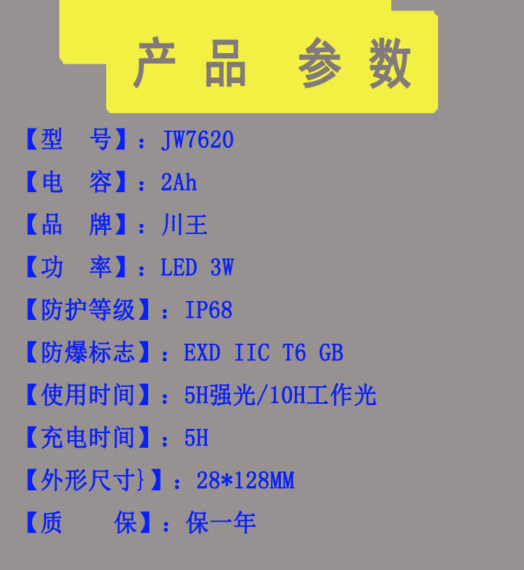 jw7620固态微型强光防爆电筒 高效可靠:特制的锂电池,体积小、容量大、无记忆、自放电率低、循环寿命长,是理想的电源选配装置。实用节能:光源采用美国原装进口3wled光源,发光效率高,光通量≥138lm,光源寿命达到100000小时。色温为6000k光色呈白色,聚光效果良好,照射距离远。设计新颖:发光强度设计为强弱两挡,使用与不同工作环境,同时还具备频闪功能。防水耐用:采用航空专用铝材(6063),使bzc6012微型防爆强光手电的重量更轻,外壳更坚固,确保产品能承受强力撞击和冲击,表面采用阳极氧化处理,表面美观大方,可有效提高耐磨、防腐性能。