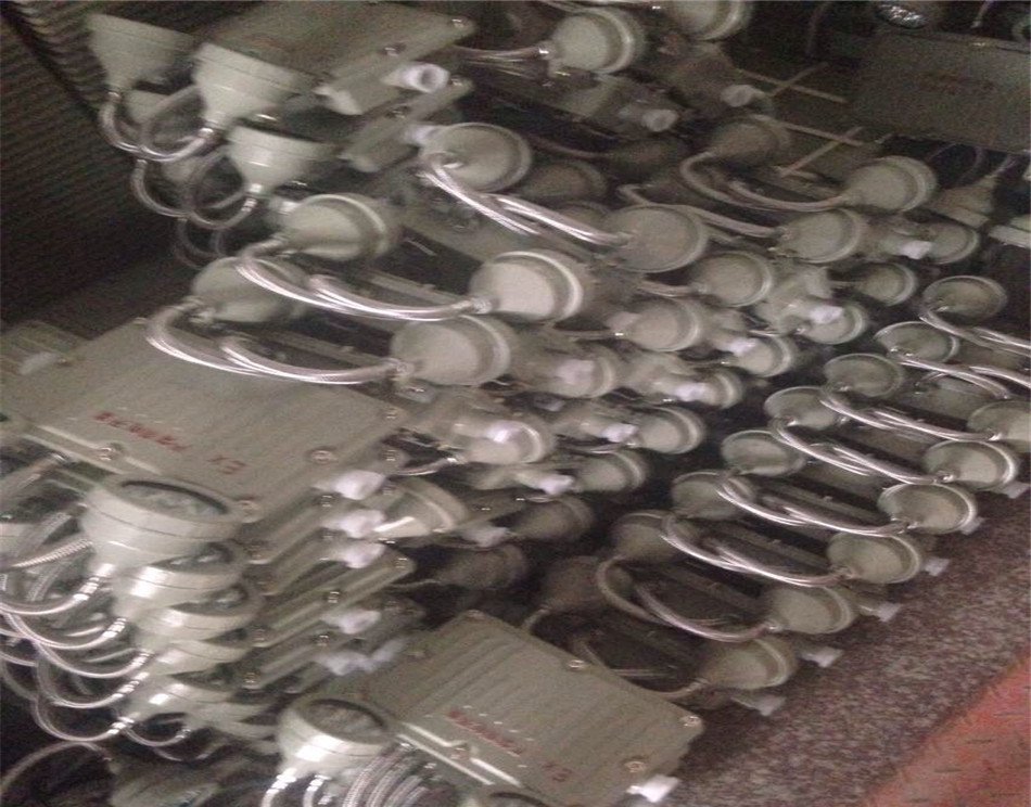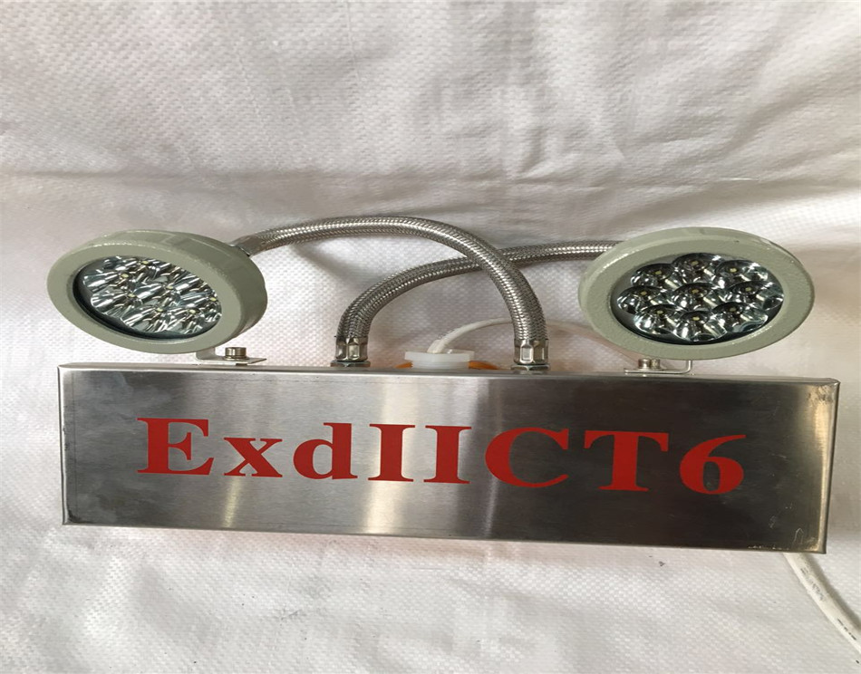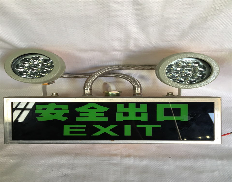 一种LED防爆消防应急灯,其包括:具有开口的壳体,壳体的开口周缘设有围绕开口一周的安装凸缘,安装凸缘设有平面隔爆接合面,壳体的侧壁设有螺纹孔及安装孔;盖设在壳体的开口的面盖,面盖设有与平面隔爆接合面抵接的第二平面隔爆接合面;安装在螺纹孔内的隔爆接头结构,隔爆接头结构包括压紧螺母及填料件;安装在安装孔内、并用于控制LED防爆消防应急灯的工作状态的控制杆组件,控制杆组件包括控制杆、开口挡圈、O型密封圈、按钮帽及复位弹性件;安装在面盖的台阶部内的透明件,透明件的周缘与台阶部的侧壁之间均存在间隙,间隙内填充有密封胶。上述LED防爆消防应急灯具有防爆功能