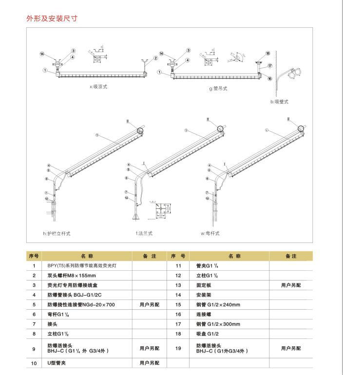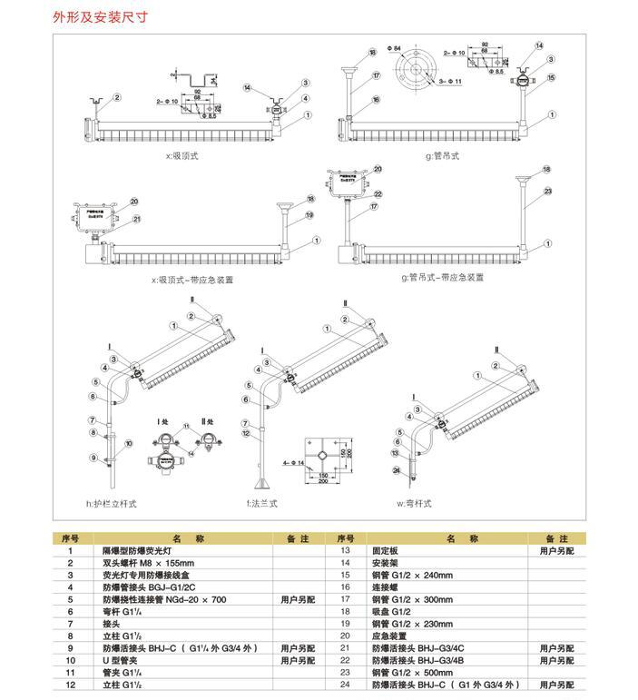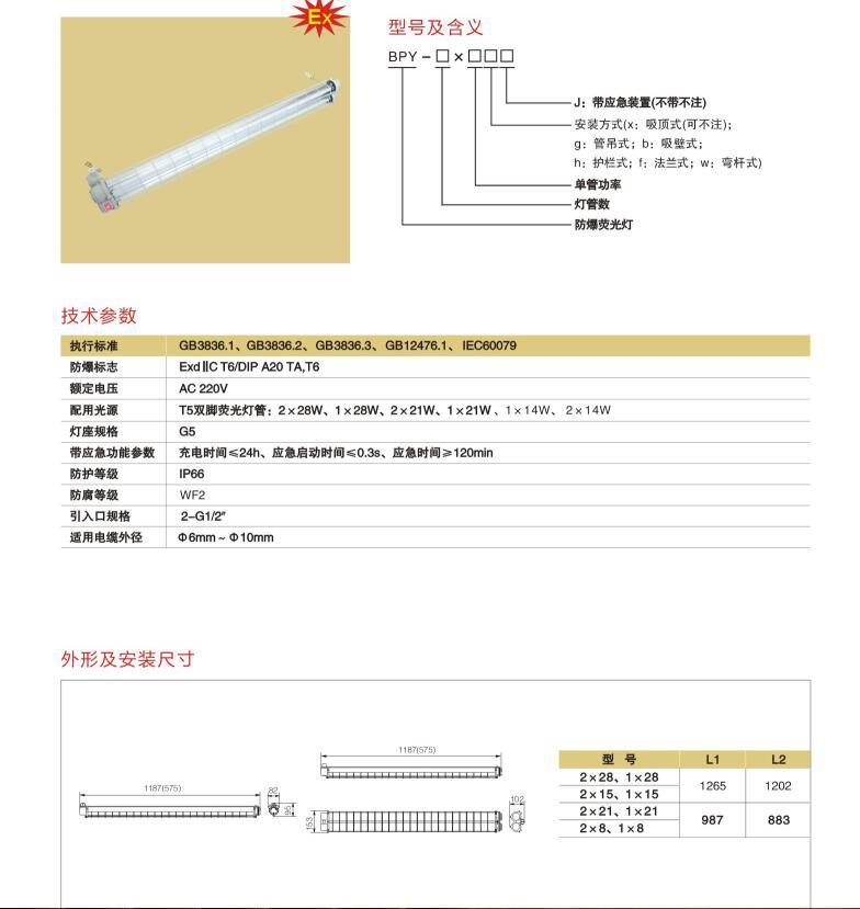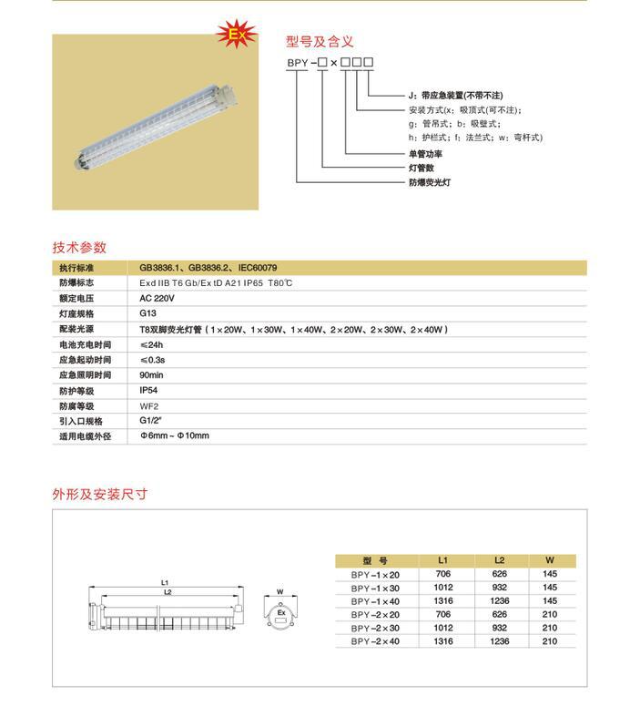 行标准:GB 3836.1、GB 3836.2、GB 3836.3、GB 12476.1、IEC60079 防爆标志ExdⅡCT4、DIP A20 TA,T6 额定电压:AC 220V 配装光源:T8双脚荧光灯管(1 36W、2 36W) T5双脚荧光灯管(1 28W、2 28W) 电池充电时间:≤24h 应急起动时间:≤0.3s 应急照明时间:90min 防护等级:IP65 防腐等级:WF2 引入口规格:3-G3/4" 适用电缆外径:φ9mm~φ14mm