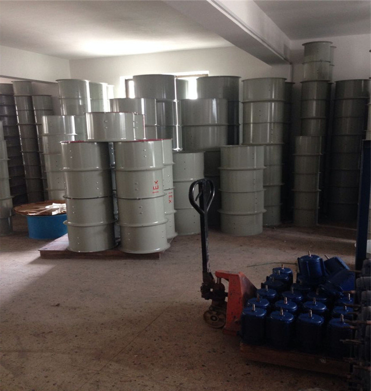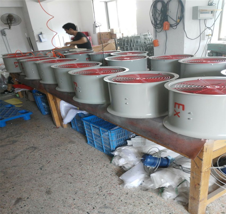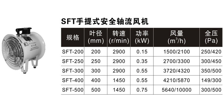 手提式防爆风机, 风筒由热锌浸板表面喷漆,叶轮为铝合金材质,镀锌网罩,玻璃纤维增强尼龙材料铸塑手柄,铝壳电机构造。体积轻巧,移动方便,吸风力强,安全耐用,结构合理,是造船,机械,地下工程的送风机,可与伸缩风管配套使用