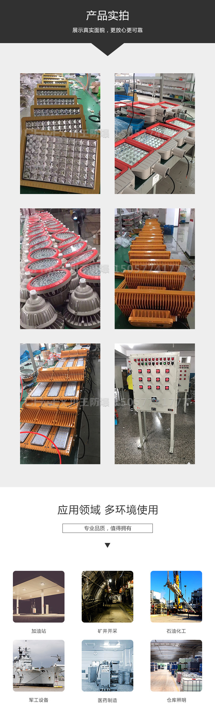 防爆灯功能 通过国家机构防爆认证,完全按照国家防爆标准生产,防爆等级,可在易燃易爆场所安全工作。光效节能 选用高强度气体放电作光源,光效高、高显色性,光线柔和、照度均匀,平均使用寿命长达55000小时以上;显色指数>90。适用环境 外壳选用特殊高硬度合金材料,多重减震结构和一体化设计、精密的结构设计和表面密封处理,具有极强的防震和抗冲击能力,坚固耐用,防尘防腐,可在户外各种恶劣环境中长期使用。