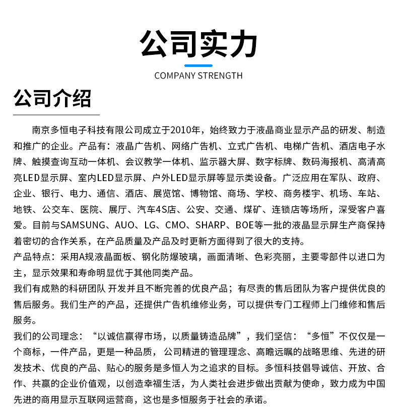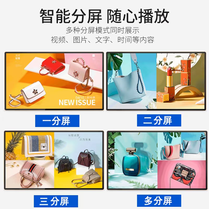 功能齐全:支持横竖屏播放,视频分屏,滚动字幕,定时开关,USB数据导入等功能。