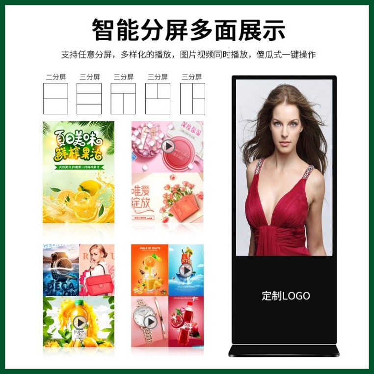 功能齐全:支持横竖屏播放,视频分屏,滚动字幕,定时开关,USB数据导入等功能。