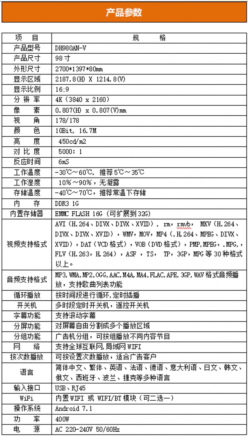 功能齐全:支持横竖屏播放,视频分屏,滚动字幕,定时开关,USB数据导入等功能。