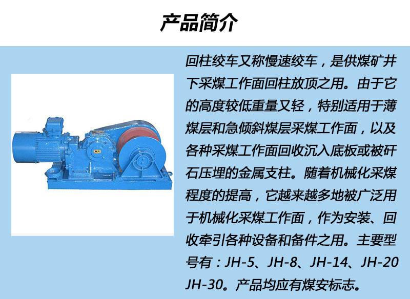 回柱绞车是煤矿井下回柱放顶之用,适用于薄煤层和急倾斜采煤工作面,以及在各种采煤工作面上回收被矸石长结的金属支柱或沉入底板。回柱绞车也可用作移溜槽,搬移皮带运输机头等辅助牵引工作。回柱绞车的电气设备具有防爆性能,可用于有煤尘及瓦斯的矿井中。