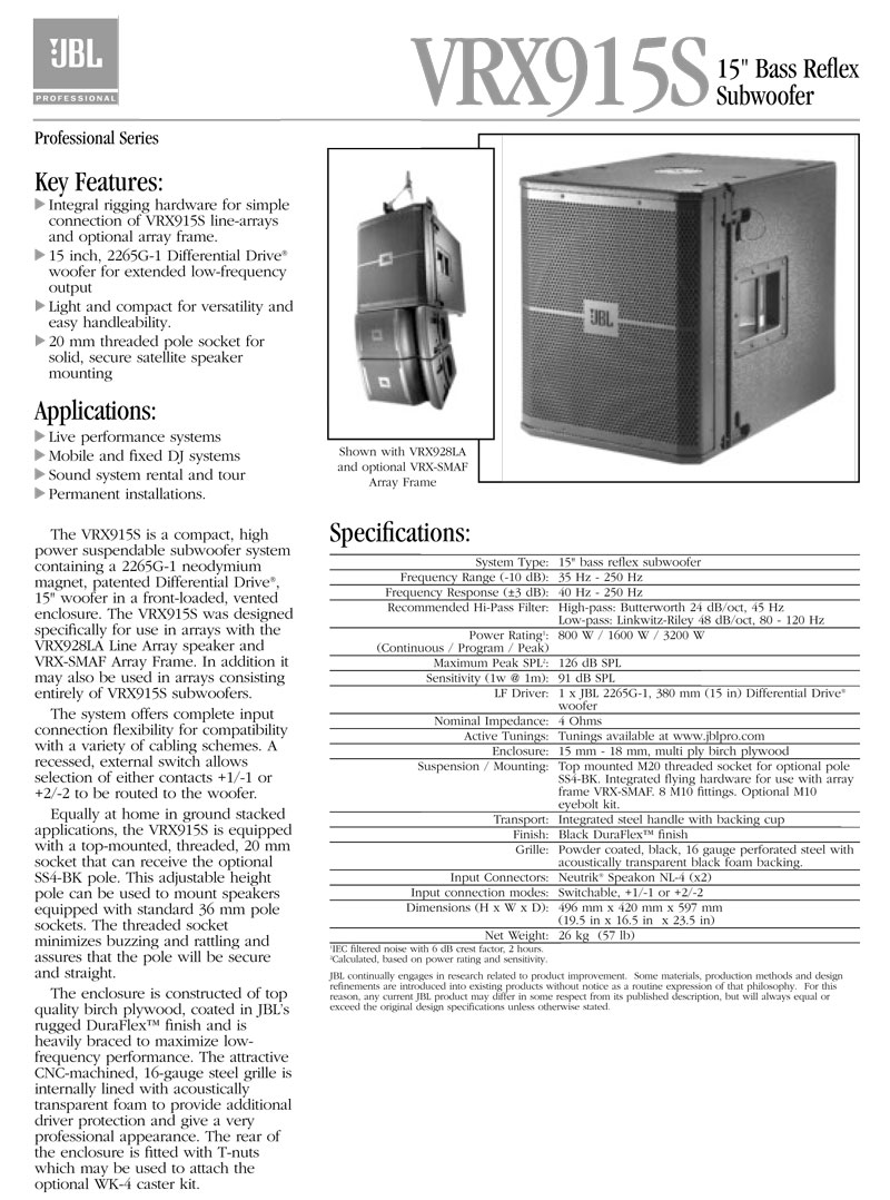 VRX915S是一款紧凑的大功率可悬挂低音炮系统,在前置通风孔中包含2265G-1钕磁铁,的DifferentialDrive?,15英寸低音扬声器。
