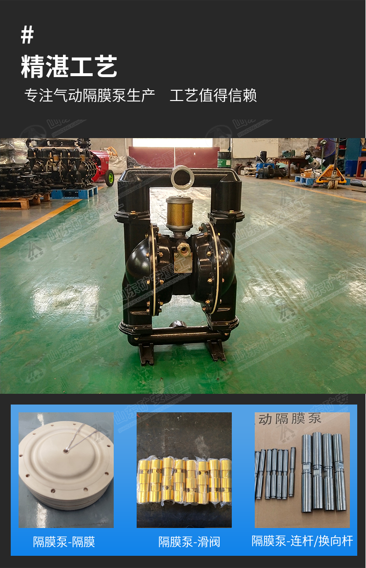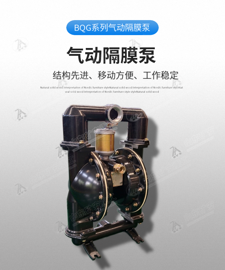 BQG系列矿用气动隔膜泵利用气室中的压力差在液体室中交替产生吸入液体和排出液体,控制阀门开关可确保液体的正向流动。通气后,泵开始运行,并连续工作以所需压力保持不变,泵将增加并保持输送管压力,而且在达到输送管压力(或分配阀关闭)时,将停止工作,并且在需要时,恢复泵送。