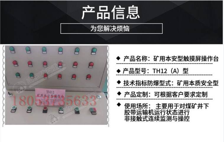 TH12(A)矿用本安型操作台主要用于对煤矿井下胶带运输机运行状态进行非接触式连续监测与操控。其外形美观,显示直观,操作方便。操作台具有较宽的工作模式,通过操作台可对其所配系统的运行进行集中操作,系统运行状态集中显示。通过操作台触摸屏可以对系统参数进行实时显示和设定。