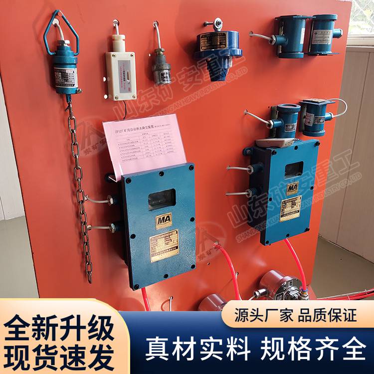 矿用采煤机尘源跟踪洒水降尘装置包括矿用隔爆兼本安型采煤机尘源跟踪洒水降尘装置主控箱、矿用隔爆兼本安型采煤机尘源跟踪洒水降尘装置分控箱、矿用本安型电动球阀、煤矿井下用数字压力表、矿用本质安全型红外发射器、矿用本质安全型红外接收器、矿用本安型触控传感器、单流体水幕等产品,具有采煤机采煤时尘源跟踪洒水、液压支架移架洒水、液压支架放煤洒水、矿灯照明等功能,可实现液压支架一架或多架一喷。本装置主要用于煤矿井下综采工作面,当采煤机采煤、液压支架移架及放煤时喷雾洒水,可有效治理工作面粉尘,优化工作面作业环境。
