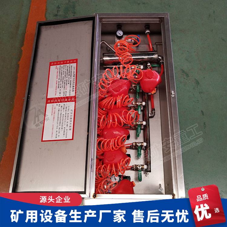 此装置在压风自救装置的基础上增加了进水管、净水过滤器、水型压力表、排水装置(多组)等。箱体、安装板、总进气管、总进水管采用不锈钢制造而成。一箱六组供水,六组供气(可根据要求设计组别)。