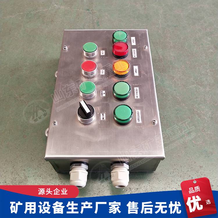 AH0.6/12矿用本安型按钮箱,适用于煤矿井下有瓦斯、煤尘爆炸气体的环境中,配套矿用隔爆兼本安型 设备或本安型设备使用,通过按钮箱上的按钮发出开关量信号给联机设备,联机设备接到信号后发出执行信 号,通过按钮箱的指示灯进行指示。 技术特点 □可选配多种类型按钮,如自恢复按钮、自锁按钮、3档或2档 旋钮、急停按钮等。 □可选配多种颜色指示灯,便于显示配接设备状态。 □ 壳体选用304不锈钢材质,美观大方,耐腐蚀 主要技术参数 □工作电压范围:DC12V±5%,工作电流:≤600mA。 □接点容量:DC12V/0.6A