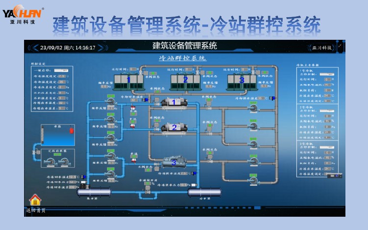 1.对冷热源设备、冷却塔、冷却泵、冷冻泵集中式程控或者就地控制及信号联动的反馈