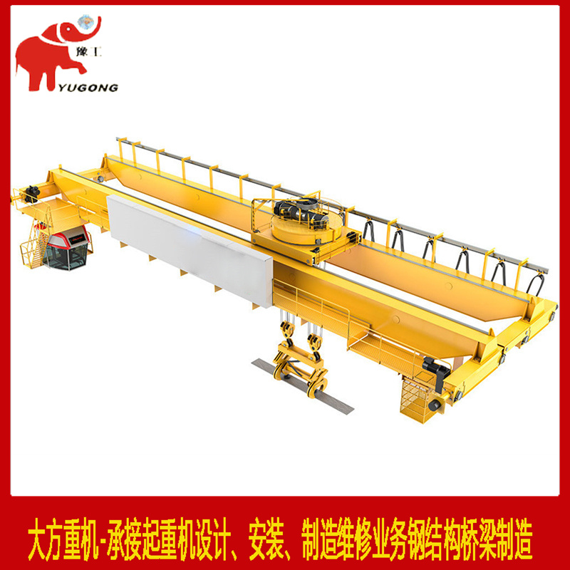 桥架结构由两根主梁、两根端梁组成。主梁采用正轨箱型梁结构,在垂直、水平和扭转载荷作用下具有很好的强度和刚度。主梁两侧设有布置大车运行机构、电控设备、小车导电装置及供检修用的走台。端梁为箱形结构,为了运输方便,端梁分段,用高强螺栓连接,安装简便。小车钢轨采用焊接接头,整体轨道,大大减小了小车运行过程中产生的冲击。主、端梁材质采用Q235板材。主梁成型后的四条主焊缝全部采用“X”射线或超声波探伤,确保焊接质量。在导电侧设有检修滑线用检修吊笼。