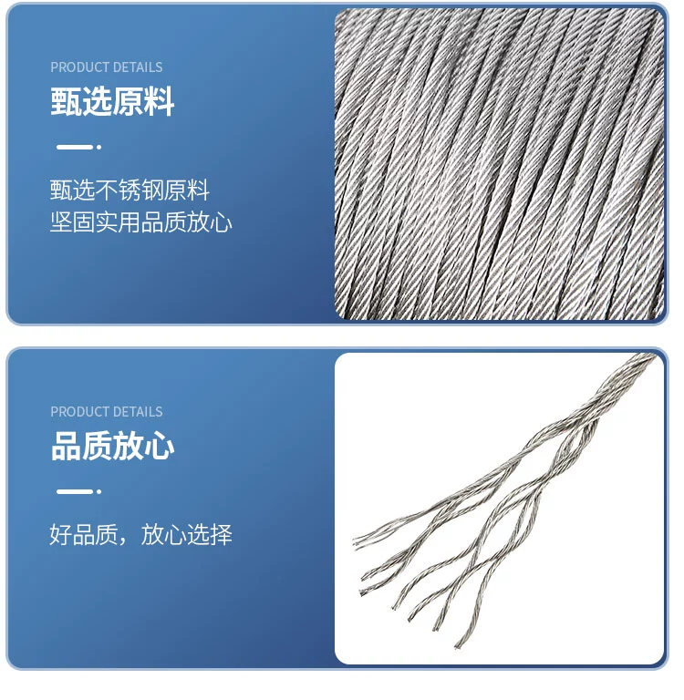 【产品应用】 多股不锈钢丝绳(7*7/7*19/7*37)广泛使用在不锈钢吊索具、汽车传动用不锈钢丝绳、船舶用不锈钢丝绳、养殖用不锈钢丝绳、膜结构用不锈钢丝绳、隐形防盗网用不锈钢丝绳、自动晾衣架不锈钢丝绳、护栏用不锈钢丝绳、灯具用不锈钢丝绳、航空飞行收紧绳、电动机拉索、电动葫芦用不锈钢丝绳等。适宜于牵引、拉拽、捆扎等多方面的用途。